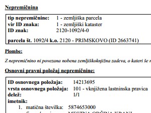 ![]() V izpisu iz zemljiške knjige tako lahko najdete podatke o lastniku nepremičnine Prav tako pa najdete tudi podatke o stvarnih pravicah na nepremičninah, kot so npr. vknjižene služnostne pravice ali plombe. |