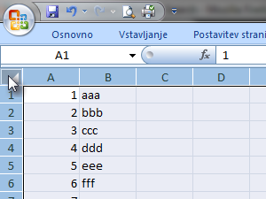 ![]() Vse celice so privzeto nastavljene kot zaklenjene, zato bomo najprej odklenili vse celice ter naknadno določili, katere bodo zaklenjene. Označite vse celice, tako da kliknete na zgornji levi rob tabele. |