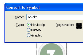 Odpre se okno za ustvarjanje simbola. V okno Name vpišite objekt, označite Movie clip in kliknite na gumb OK. |