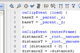 Pritisnite tipko F9, da odprete okno za vnašanje akcijske kode in vpišite naslednje: onClipEvent (load) { baseX = _parent._x; baseY = _parent._y; } onClipEvent (enterFrame) { distanceX = _root._xmouse-_parent._x; distanceY = _root._ymouse-_parent._y; if (distanceX < 0) { distanceX = -distanceX; } if (distanceY < 0) { distanceY = -distanceY; } distance = Math.sqrt((distanceX*distanceX)+(distanceY*distanceY)); if (distance < 350 and distance >-150) { _parent._xscale = distance; _parent._yscale = distance; } } onClipEvent (mouseMove) { updateAfterEvent(); } Zaprite okno za vnašanje akcijske kode. |