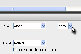 V oknu Properties Color preko izbirnika določite na Alpha in potem mu nastavite vrednost 45%. Če okna Properties ne vidite, pritisnite tipki CTRL + F3. |