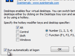 ![]() Privzeta bližnjica za prehod med različnimi namiziji je tipka Alt in številka. Če želite, lahko tu nastavite drugo bližnjico. Če želite več namizij redno uporabljati, izberete še možnost Run automatically at logon in program se bo ob prijavi v Windows okolje vedno sam zagnal.