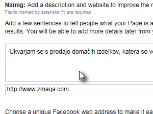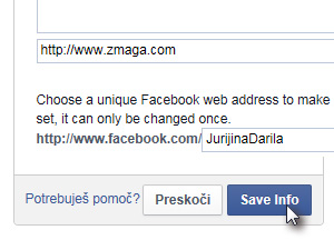 ![]() Spodaj še napišite spletni naslov, ki bi ga radi imeli in kliknite na gumb Save Info. Facebook žal nima dovolj denarja, da bi uredil prevode v slovenski jezik :( |