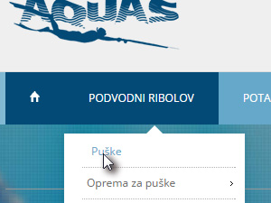 ![]() Kliknite tukaj, da odprete spletno stran, kjer lahko opravite nakup opreme za podvodni ribolov. Pokazal vam bom, kako se opravi nakup puške za podvodni ribolov. Na strani se z miško premaknite nad Podvodni ribolov in izberite Puške. |
