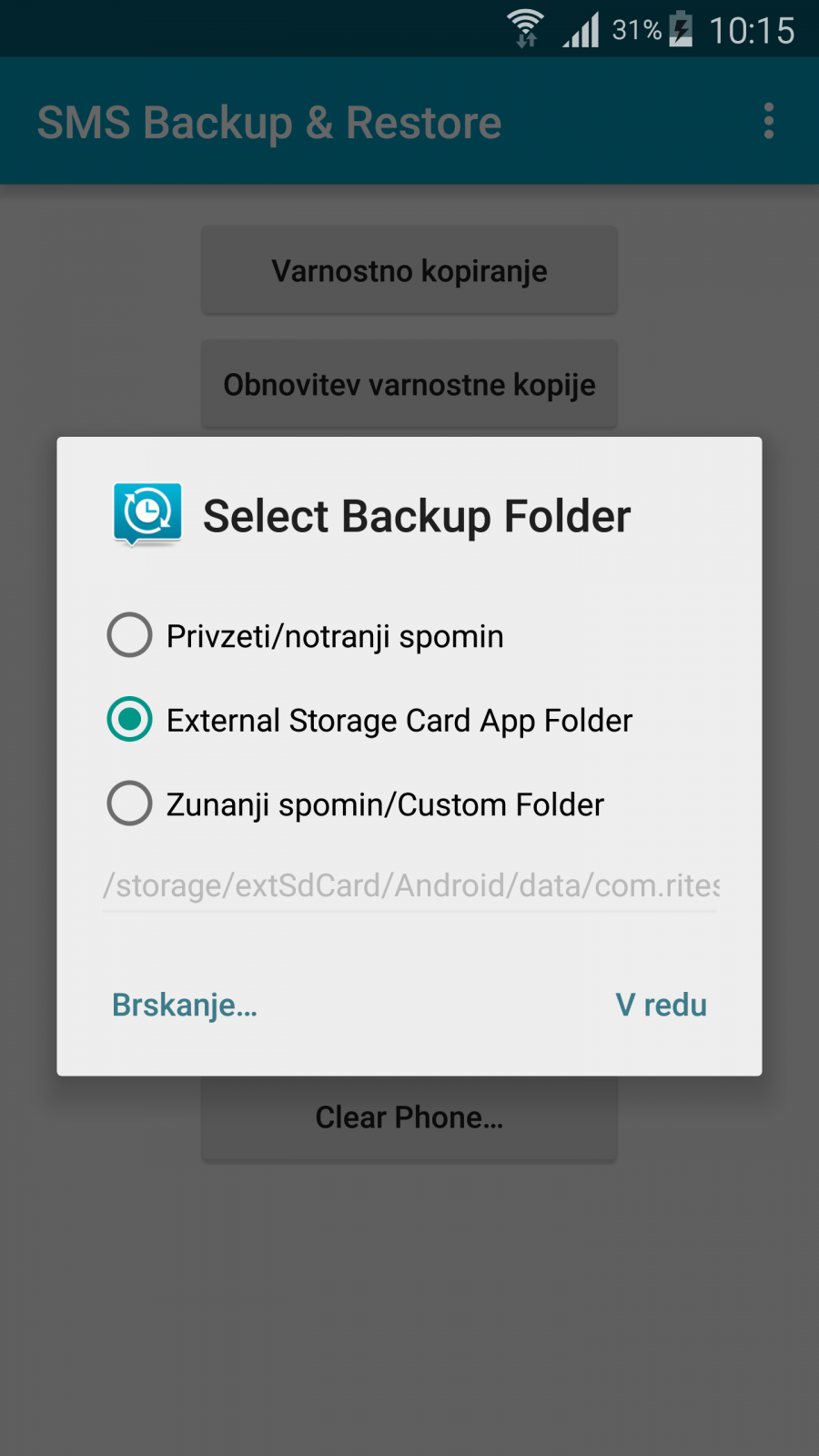 ![]() Ko potrdite izbiro s klikom na gumb V redu, se bo varnostno kopiranje SMS in MMS sporočil izvedlo. |