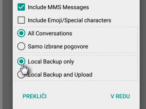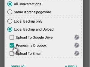 ![]() Imate pa tudi možnost, da izberete Local Backup and Upload, kjer lahko izberete, da se SMS sporočila shranijo na Google Drive, Dropbox ali pa se pošljejo na elektronski naslov. |