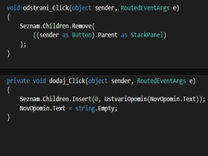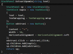 ![]() Sedaj ko je uporabniški vmesnik pripravljen pojdimo na kodo. (MainWindow.xaml.cs) Nastavimo mu napis: Text = text (ki je prišel v metodo UstvariOpomin) Ter TextWrapping (Iz enakega razloga kot pri TextBoxu iz prejšnih korakov) Ker hočemo funcijo brisanja mu dodamo .Click metodo odstrani_Click (glej nasledni korak), katera se sproži ob kliku na gumb. |