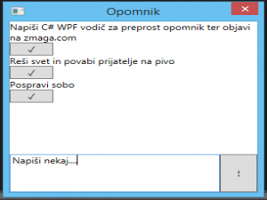 ![]() Pod kodo iz prejšnega koraka (še vedno smo v znački <Grid> ) dodajmo kontrolo, ki bo shranjevala naše opomnike, ter jo ovijmo v kontrolo ki bo omogočila "scrollanje" kadar bomo imeli veliko opomnikov! <ScrollViewer VerticalScrollBarVisibility="Auto" Grid.ColumnSpan="2"> <StackPanel Name="Seznam" ></StackPanel>