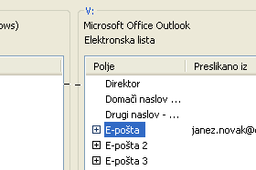 To storimo tako, da z levimi miškinim gumbom izberemo elektronski naslov na levi strani, gumb držimo pritisnjen, ter prestavimo izbrani elektronski naslov na desno stran nad vrednost E-pošta ter tam spustimo miškin gumb. Dobiti moramo rezultat, ki je prikazan na sliki, kjer se je naš e-naslov pojavil v stolpcu Preslikano iz. Izbiro potrdimo še sklikom na gumb V redu in Dokončaj. |