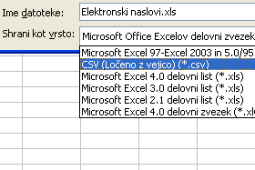 Kot vrsto datoteke je potrebno izbrati CSV (Ločeno z vejico) (*.csv).