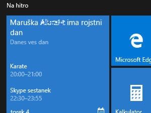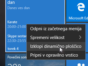 ![]() Če ne želite, da se vam prikazujejo podatki na ploščici, kliknite nanjo z desnim miškinim gumbom in izberite Izklopi dinamično ploščico. Če bi radi ploščico odstranili, izberite Odpni iz začetnega menija. |