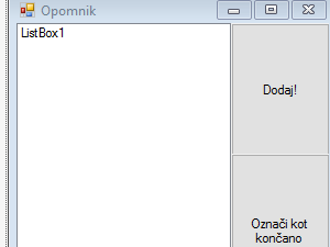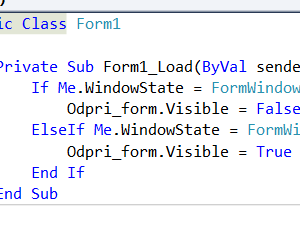 ![]() Sedaj dvokliknemo na okno programa (Form). Odpre se funkcija Form_Load, v katero vnesemo naslednjo kodo: If Me.WindowState = FormWindowState.Normal Then Odpri_form.Visible = False ElseIf Me.WindowState = FormWindowState.Minimized Then Odpri_form.Visible = True End If End Sub Private Sub Form1_SizeChanged(ByVal sender As Object, ByVal e As System.EventArgs) Handles Me.SizeChanged If Me.WindowState = FormWindowState.Minimized Then Me.ShowInTaskbar = False Me.Visible = False End If End Sub Private Sub Form1_VisibleChanged(ByVal sender As Object, ByVal e As System.EventArgs) Handles Me.VisibleChanged If Me.WindowState = FormWindowState.Normal Or Me.WindowState = FormWindowState.Maximized Then odpri_form.Visible = False ElseIf Me.WindowState = FormWindowState.Minimized Then odpri_form.Visible = True End If End Sub Private Sub zapri_form_Click(ByVal sender As System.Object, ByVal e As System.EventArgs) Handles Zapri_form.Click Dim result As DialogResult result = MessageBox.Show("Če boste zaprli program, boste izbrisali vse opomnike. Ali želite zapreti program?", "Zapri", MessageBoxButtons.YesNo) If result = DialogResult.No Then ElseIf result = DialogResult.Yes Then Application.ExitThread() End If |