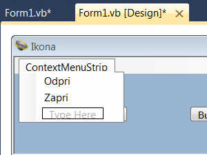 ![]() Sedaj kliknemo na ContextMenuStrip in notri vpišemo novi postavki Odpri in Zapri. |