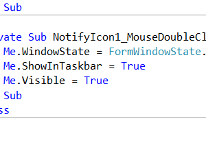 ![]() Zatem dvokliknemo še na NotifyIcon in vnesemo naslednjo kodo: Me.WindowState = FormWindowState.Normal Me.ShowInTaskbar = True Me.Visible = True End sub Private Sub Form1_FormClosing(ByVal sender As Object, ByVal e As System.Windows.Forms.FormClosingEventArgs) Handles Me.FormClosing e.Cancel = True Me.WindowState = FormWindowState.Minimized Me.ShowInTaskbar = False NotifyIcon1.BalloonTipTitle = "Program še vedno teče" NotifyIcon1.BalloonTipText = "Program lahko odprete, zaprete tukaj..." NotifyIcon1.ShowBalloonTip(2) (2) določa število sekund, kolikor bo obvestilo o pomanjšanju v orodno vrstico vidno.