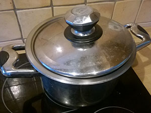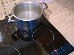 Nato pa pripravil lonec s polno vode in ga postavil na kuhalno ploščo z nastavljeno najvišjo temperaturo.