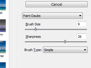 ![]() Kliknite zgoraj na Filter in izberite Filter Gallery... V novem oknu v polju Artistic določite Paint Dubs in nastavite poljubne vrednosti. Ne zaprite še okna ...