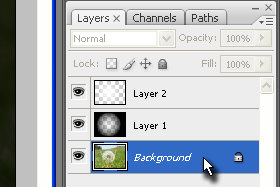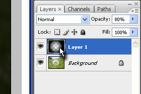 Beli krog oziroma odsev se je označil, vendar pa je prvotni (background) layer še vedno selektiran.