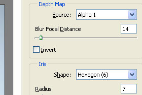 Odpre se novo okno. Source določite Alpha 1 (oziroma prej ustvarjeni novi kanal). Blur Focal Distance nastavite 14 in Shape Hexagon (6). Ne zaprite še okna... |