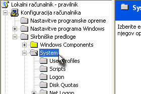 Kot primer bom navedel, kako izklopimo za nekatere nadležni avtomatski prikaz okna, ki se pojavi vsakič, ko vstavimo v računalnik novo zgoščenko. Najprej kliknemo na System, ki se nahaja pod Skrbniškimi predlogami. |