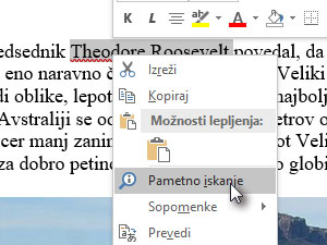 ![]() Kliknite na označeno besedilo z desnim miškinim gumbom in izebrite Pametno iskanje. |