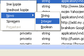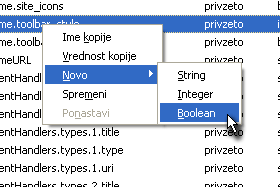 Ta vrednost dejansko ne zmanjša količine uporabljenega pomnilnika, ponuja pa možnost, da Windows vsebino pomnilnika, ki ga zaseda Firefox, začasno shranij na disk, tako da lahko ta pomnilnik uporabljajo tudi drugi programi. Za uporabo te vrednosti je potrebno ustvariti novo vrednost. To storimo tako, da kliknemo z desnim miškinim gumbom na katerokoli obstoječo vrednost in izberemo Novo -> Boolean. |