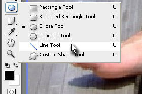 Pritisnite tipko D, da nastavite črno barvo (bela spodaj). Potem pa izberite orodje Line Tool. Držite z miško na orodju Ellipse Tool (bližnjica je tipka U), da se prikažejo ostala orodja. |
