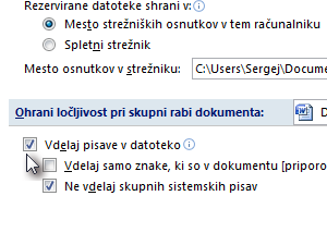 ![]() Na desni strani sedaj obkljukajte možnost Vdelaj pisave v datoteko. Če nameravate dokument odpirati na računalnikih, ki niso Windows, pa priporočam tudi, da odstranite kljukico pri možnost Ne vdelaj skupnih sistemskih pisav.