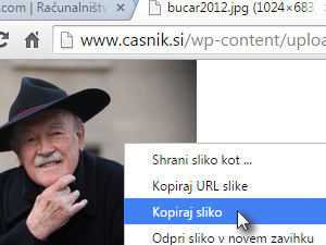![]() Četrti način je tudi zelo uporaben, kjer lahko slike kopirate iz drugih programov. zanimiv pa jetudi zaradi tega, ker si Photoshop zapomni tudi dimenzije kopirane slike. V spletnem brsklaniku prikažite neko poljubno sliko in kliknite na njo z desnim miškinim gumbom ter izberite Kopiraj sliko. |