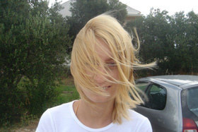 Jaz sem odprl fotografijo, kjer mi pozira Mojca in ji veter v laseh prekirava obraz.