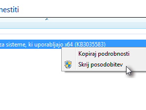 ![]() Med ponujenimi posodobitvami je zopet treba najti posodobitev KB3035583. Nanjo kliknemo z desnim miškinim gumbom in izberemo Skrij posodobitev. Na ta način smo se za vedno znebili ikone za prodobitev Windows 10. |