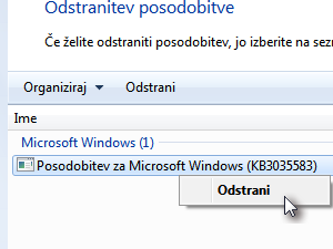 ![]() Z desnimi miškinim gumbom kliknemo na KB3035583 posodobitev in izberemo možnost Odstrani. |