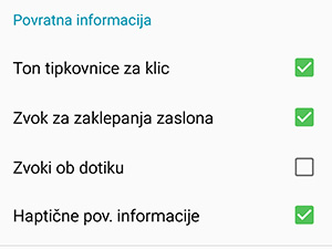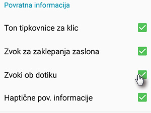 ![]() V polju z nastavitvami za povratne informacije polje poiščite Zvoki ob dotiku ter izklopite zvok tako, da tapnete na zeleno puščico. |