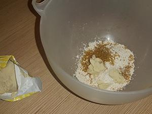 Pripravite posodo in v njo dodajte dve žlici pirine moke, žlico rijavega sladkorja in polovico kvasa v zavojčku.