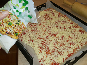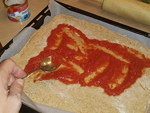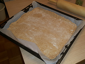 Po tem času pripravite pekač, dodajte vanj papir za peko in nato razvalite testo. Jaz sem si prej pomagal z valjarjem. |