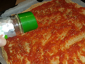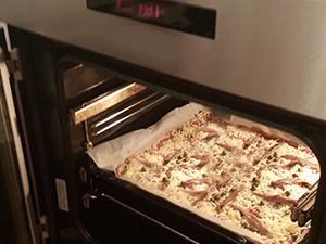 Postavite sedaj pekač z pripravljeno pico v prej segreto pečico na okoli 220 stopinj Celzija in jo pecite okoli 10 minut. |