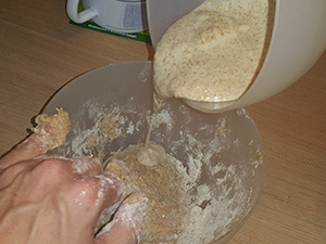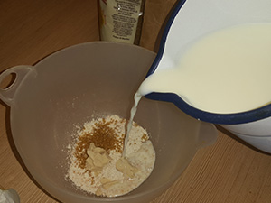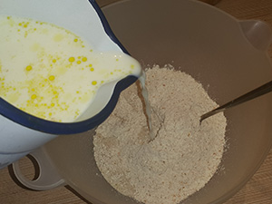 V prej pogreto mleko dodajte dobro žlico olivnega olja in ga postopoma prilijte v posodo s pirino moko. |