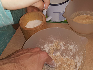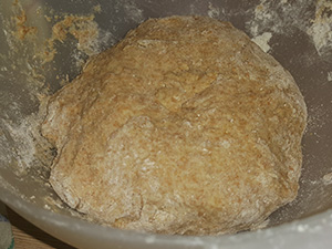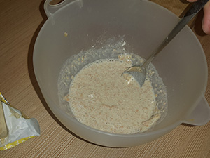 Lonec s pripravljenim testom pokrijte za okoli 2 uri, da bo kvas opravil svoje delo. Ne pričakujte, da se bo testo napihnilo enako kot pri pšenični moki. Važno je, da je testo po tem času malo bolj mehko. |