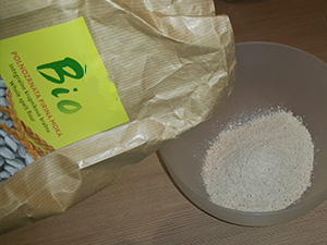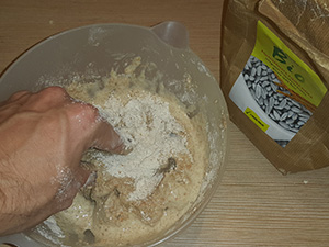 Medtem pa pripravite drugo posodo in v njo dodajte okoli 300 gramov pirine moke. |