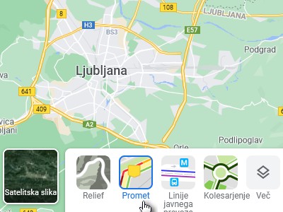 ![]() Na Google Zemljevidu si lahko ogledate, kakšno je stanje prometa na posameznih cestnih odsekih in tako hitro vidite, ali so kje zastoji. Najprej odprite Google Zemljevid: |