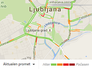 ![]() Ceste na zemljevidu se bodo sedaj obarvale glede na to, kakšno je stanje prometa na njih. Z zeleno barvo je označeno tam, kjer promet poteka normalno. Z rdečo barvo pa so označeni odseki, kjer se pojavljajo zastoji. |