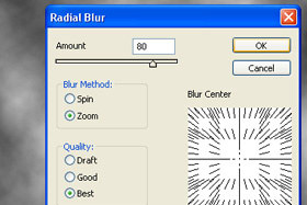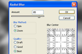 Kliknite zgoraj na Filter, Blur in izberite Radial Blur... Odpre se novo okno. Amount nastavite 85, Blur Method Zoom in Quality Best. Kliknite na gumb OK. |