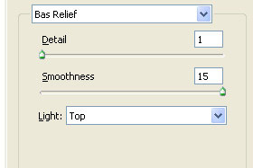 Kliknite zgoraj na Filter, Sketch in izberite Bas Relief... Odpre se novo okno. Detail nastavite 1, Smoothness 15 in Light Top. Kliknite na gumb OK. |