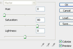 Pritisnite tipki CTRL + U, da odpre okno za nastavljanje barv. Označite Colorize. Nastavite poljuben Hue in Saturation. Jaz sem določil Hue 0 in Saturation 80 (Lightness pustil na 0). Kliknite na gumb OK. |