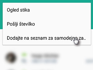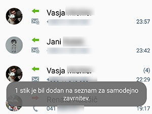 ![]() Pojavilo se vam bo obvestilo, da je bil stik dodatn na seznam za samodejno zavrnitev. |
