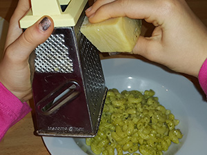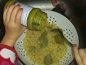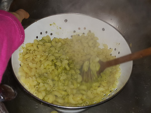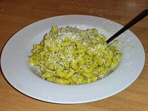 Kodo makaroni kuhani, jih postavite v posodo s cedliom, da voda odlije in dodajte pesto. Najbolj znan je Pesto alla genovese iz Genove v Ligurniji (Italija). Sestavljen je iz sveže bazilike, praženih jedrc pinije, pecorino sardo (ali namesto njega parmezan), gob, soli, česna in olivnega olja. |