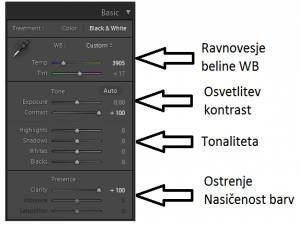 ![]() Razdelek Basic je razdeljen na več razdelkov, celotna obdelava pa poteka s pomočjo drsnikov. O prvi možnosti ne bomo veliko govoril: Color (fotografija je brvna), Black&White (fotografija je črno bela). |