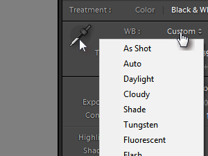 ![]() Zelo uporabna je možnost uporabe kapalke, s katero kliknemo na območje na fotografiji, ki bi moralo biti bele barve. Lightroom bo tako samostojno izbral pravilne nastavitve, mogoče pa je izbrati tudi med nekaterimi predpripravljenimi možnostmi. |