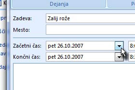 V polje Zadeva vpišite poljubno ime, ki bo predstavljal dogodek. Da ne bom pozabil zalivat svojih rož, si bom nastavil opomnik za njihovo zalivanje. Potem pa kliknite na jeziček za koledar (glej sliko)... |