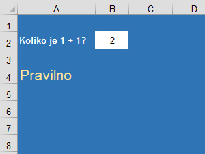 ![]() Nato pa dopišite še "Pravilno";"Nepravilno")) (glej sliko). V mojem primeru je formula =IF(B2="";"";IF(B2=2;"Pravilno";"Nepravilno")). Kliknite na gumb V redu, da potrdite. |