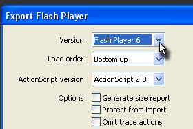 Odpre se okno z raziskovalcem, kjer vnesite poljubno ime in kliknite na gumb Save. Version določite Flash Player 6 in kliknite na gumb OK. Če boste shranili pod novejšo različico, vam efekt ne bo deloval. |